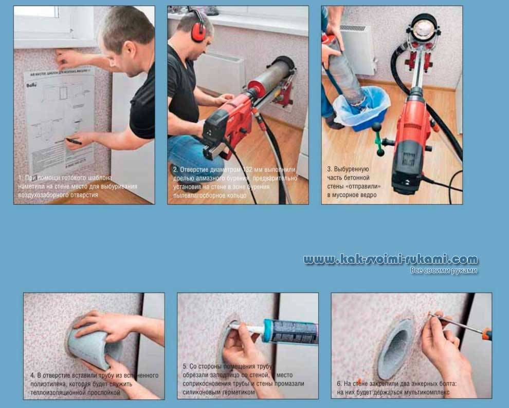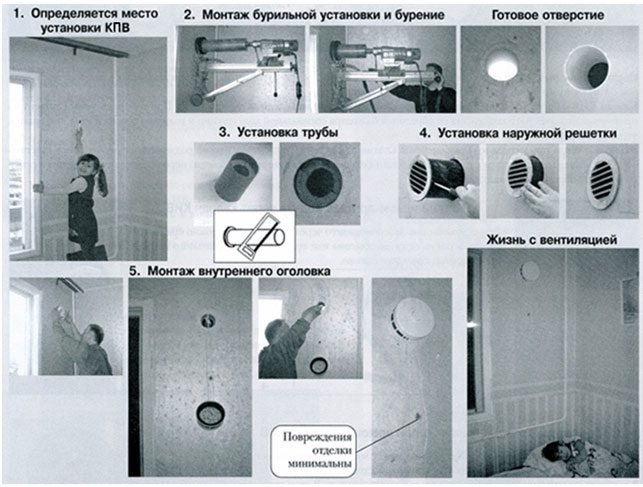 Un trou est percé dans le mur. Il devrait avoir une légère pente (3-4 degrés) vers la rue - afin que l'humidité ne s'accumule pas lorsqu'elle pénètre dans le conduit.