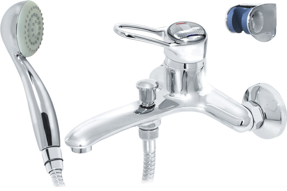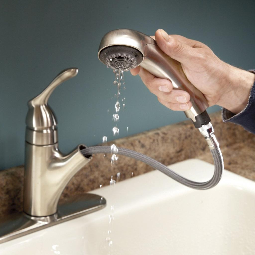 La douche est remise en place sous le poids d'un poids, qui est relié par un fil à la pomme de douche, et le fil lui-même passe à travers le «tuyau» du bec.Cependant, il existe des conceptions de robinet de cuisine avec une douche, qui est maintenue sur un ressort hélicoïdal enroulé autour d'un bec ; il existe d'autres options de conception.