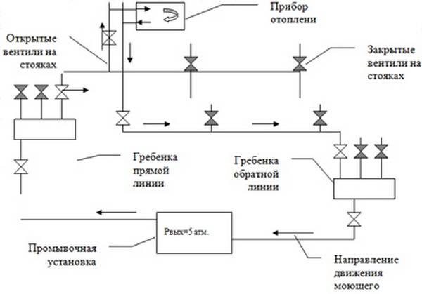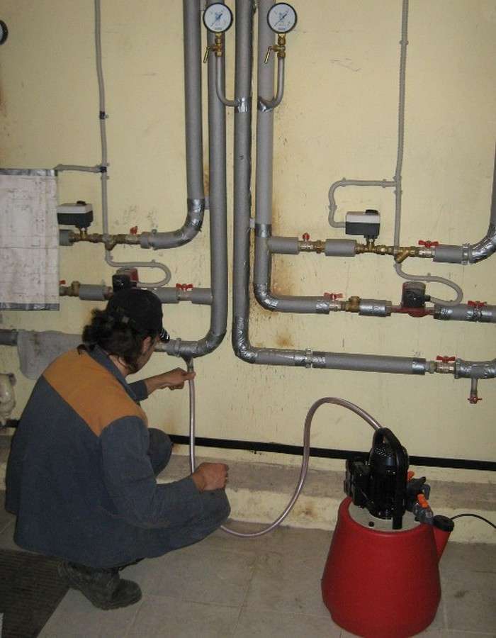 Le processus est facile à contrôler par l'apparence de l'eau, qui devrait finalement devenir propre et transparente. Après nettoyage du groupe de colonnes montantes, le chauffage se réarme et la ligne de retour s'ouvre. Ensuite, la chasse est répétée, uniquement dans l'autre sens.