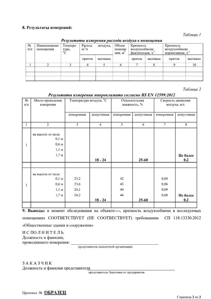 - Vérification du système de ventilation artificielle. L'état et les performances de tous les composants de la ventilation d'alimentation, mixte ou d'extraction sont vérifiés. Les données sont enregistrées dans le protocole de mesures de laboratoire. Le client reçoit un passeport de ventilation et une conclusion sur la conformité ou la non-conformité aux normes de conception.