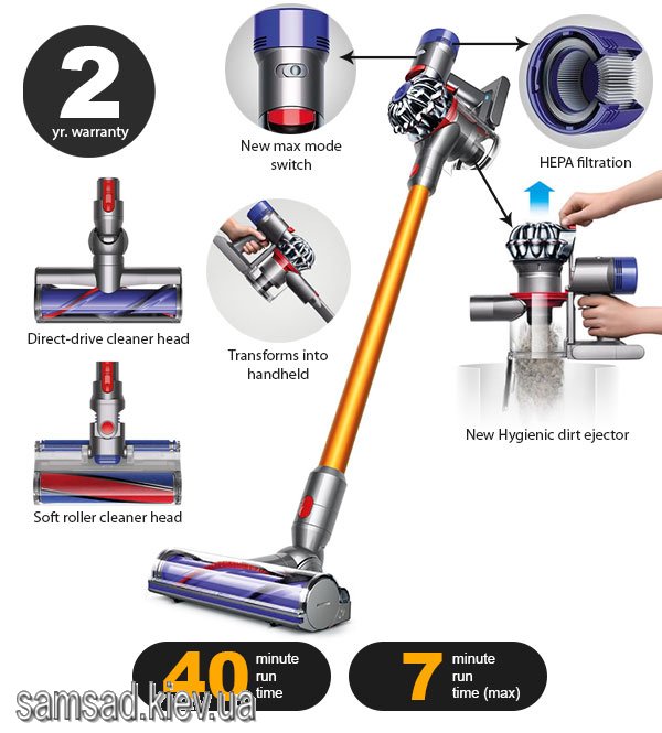 Les unités les plus compactes et les plus pratiques de toute la gamme de la marque britannique. Ils aident à nettoyer facilement la pièce, y compris les endroits difficiles d'accès. L'appareil peut être utilisé d'une seule main, ce qui est typique pour la plupart des représentants de la marque. Le kit comprend une brosse spéciale pour nettoyer les tapis et autres matériaux pelucheux.