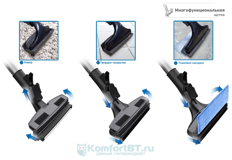 Le processus de nettoyage est grandement facilité par la présence d'un grand nombre de buses. Ainsi, dans la configuration de base, il y a : une brosse traditionnelle pour sol/moquette, une brosse pour le nettoyage humide, une buse de dépoussiérage, une brosse à tissu, une brosse à parquet et une buse de nettoyage de tissus d'ameublement.