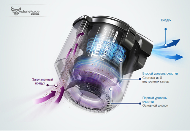 Dans la production des aspirateurs Samsung, la technologie Aqua Multi Chamber a été utilisée. C'est un réservoir avec un corps transparent, qui permet de voir tout ce qui se passe à l'intérieur de l'aspirateur lors de la filtration.