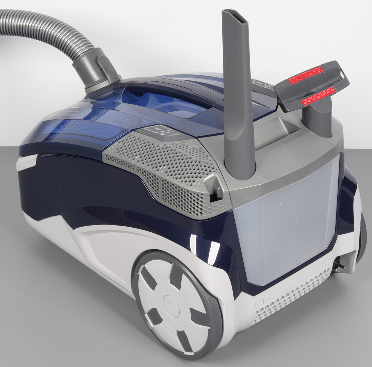 Aquafiltre modèle Twin T1 - cet aspirateur se distingue par la présence d'un système de contrôle de l'alimentation en eau. Le régulateur lui-même est situé sur la poignée du tuyau.