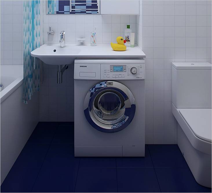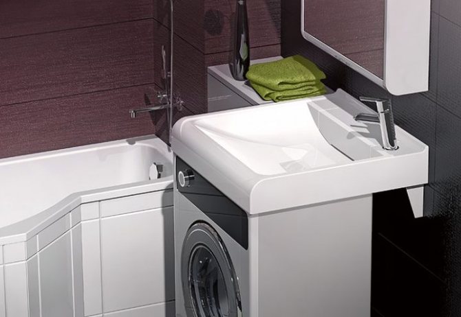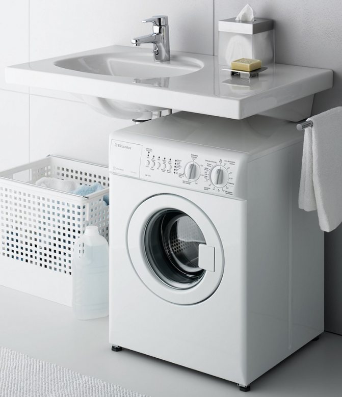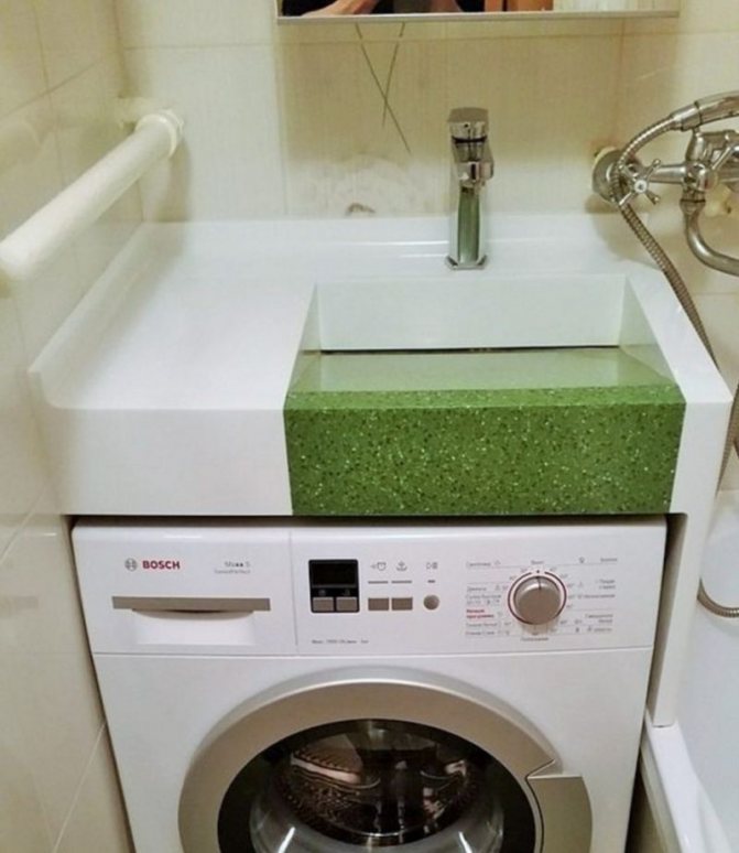 Si la situation avec la place dans la salle de bain ou la salle de bain n'est pas si critique, vous pouvez installer l'évier au-dessus de la machine à laver avec un comptoir. La machine est installée sous le comptoir. Cette option est la plus préférable du point de vue de la sécurité électrique.Il y a un inconvénient - les éviers de comptoir sont chers.