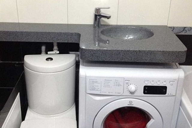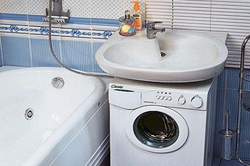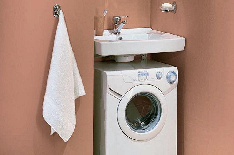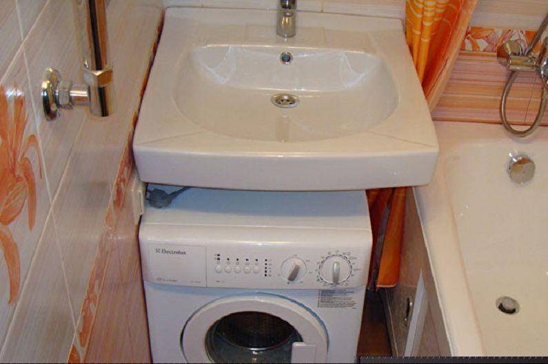 Si l'espace est important pour vous, faites attention à la conception à deux niveaux de la laveuse et de l'évier. Ici, vous devez transpirer en connectant le système d'égout à l'évier et à la machine à laver, en masquant les tuyaux