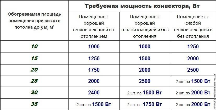 - Calcul de la puissance du convecteur en fonction de la superficie de la pièce. À condition que la pièce soit bien isolée et que la hauteur sous plafond ne dépasse pas 2,7 m, pour 10 m² de surface chauffée, 1 kW d'énergie thermique sera suffisant. Pour une salle de bain de 6 m², un radiateur pour 1 kW devrait suffire. Chambre 20 m² - convecteur d'une puissance de 2 kW.