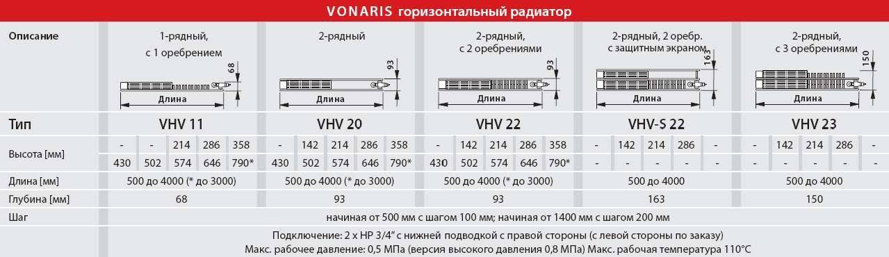 Dans le tableau ci-dessous, vous pouvez choisir un convecteur en fonction de la surface chauffée. Les hauteurs sont données en 4 versions - standard (jusqu'à 2,7 mètres), 2,8, 2,9 et 3,0 mètres.Avec une configuration angulaire des locaux, un facteur multiplicateur de 1,1 doit être appliqué à la valeur sélectionnée, tandis que dans une construction avec une isolation thermique de haute qualité - un facteur réducteur de 0,8. Avec une hauteur sous plafond supérieure à trois mètres, le calcul est effectué selon la méthode ci-dessus (en volume avec un coefficient de 0,04).