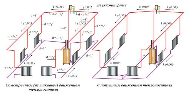 À leur tour, les systèmes de chauffage de l'eau dans une maison privée sont classés en fonction du type de câblage et sont monotube, collecteur et bitube. De plus, pour eux il existe également un classement selon le vecteur énergétique nécessaire au fonctionnement de l'appareil de chauffage (gaz, combustible solide ou liquide, électricité), et selon le nombre de circuits (1 ou 2). Ces systèmes sont également divisés par matériau de tuyau (cuivre, acier, polymères).