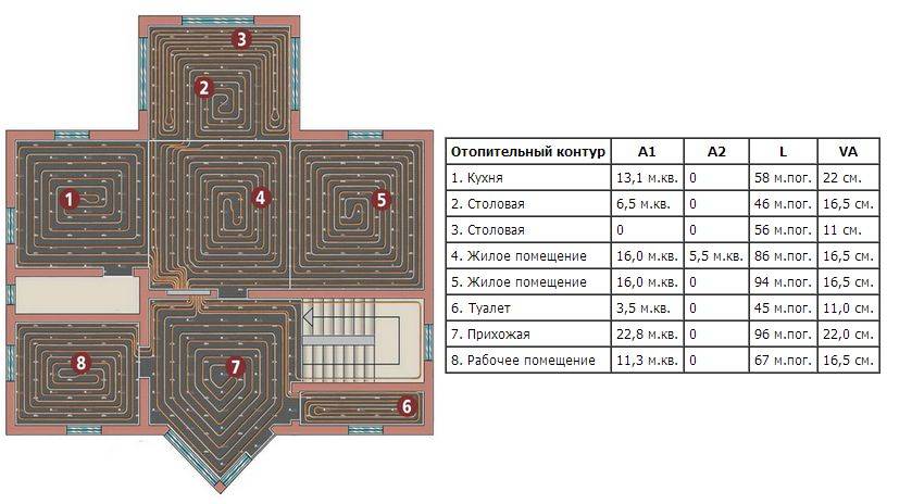Supposons qu'il ait été décidé de poser des tuyaux avec un pas de 15 cm, en même temps, 6,7 m.p. est nécessaire pour 1 m2. tuyaux, par conséquent, une superficie de 21 m2 nécessite 140,7 mètres de tuyaux. Étant donné que pour un tuyau de diamètre 20 mm, la longueur maximale du circuit est limitée et est de 120 m, vous devrez faire deux circuits d'une longueur de 71 m, afin qu'il y ait également une marge pour le raccordement au collecteur et les erreurs.