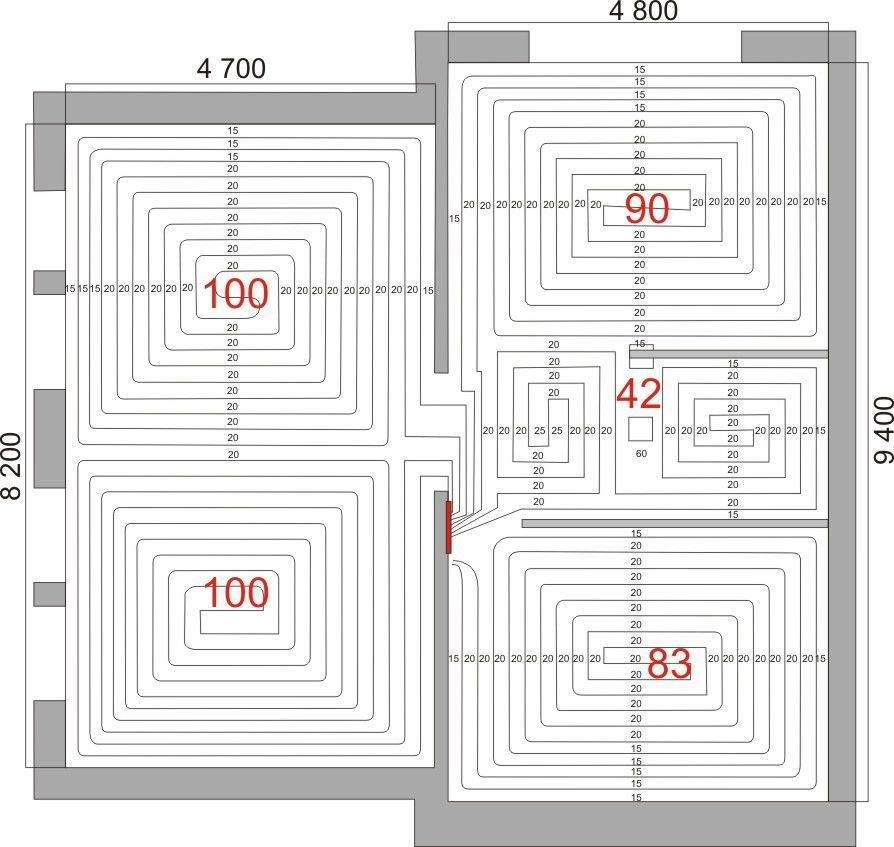 La pose d'un plancher chauffant au sol doit être réalisée selon un plan de pose préalablement préparé.Si la pièce n'est pas rectangulaire, il est nécessaire de dessiner un schéma de rectangles séparés, avec sa propre boucle en boucle.