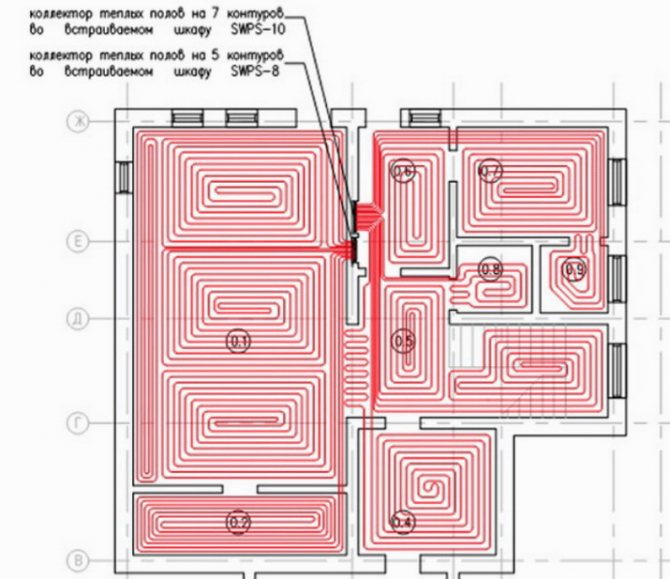 La pose avec un serpent est la plus simple, mais en passant par les tuyaux, le liquide de refroidissement se refroidit progressivement et à la fin du circuit, il fait déjà beaucoup plus froid qu'il ne l'était au début. Par conséquent, la zone où le liquide de refroidissement entre sera la plus chaude. Cette fonctionnalité est utilisée - la pose commence à partir de la zone la plus froide - le long des murs extérieurs ou sous la fenêtre.