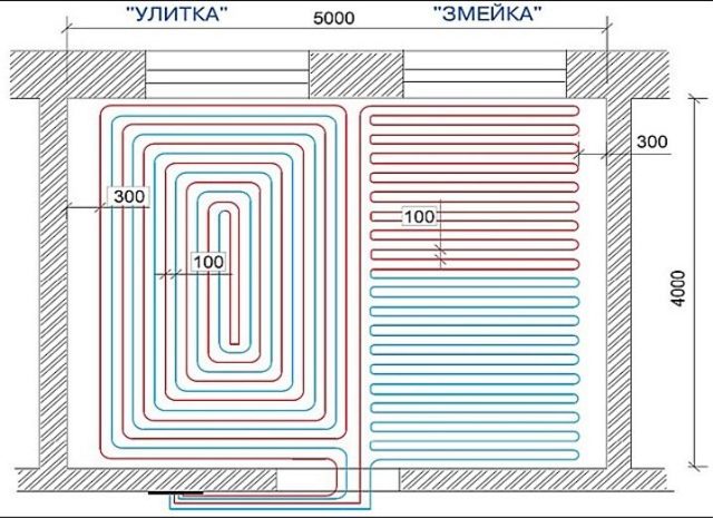 Il existe deux principaux modèles de pose de contour : un serpent et un escargot. La première option est la plus simple, mais la moins efficace, car elle donne un chauffage au sol inégal. Le second est plus difficile à mettre en œuvre, mais l'efficacité de chauffage est d'un ordre de grandeur supérieur.