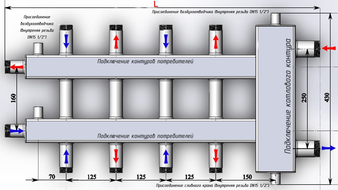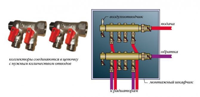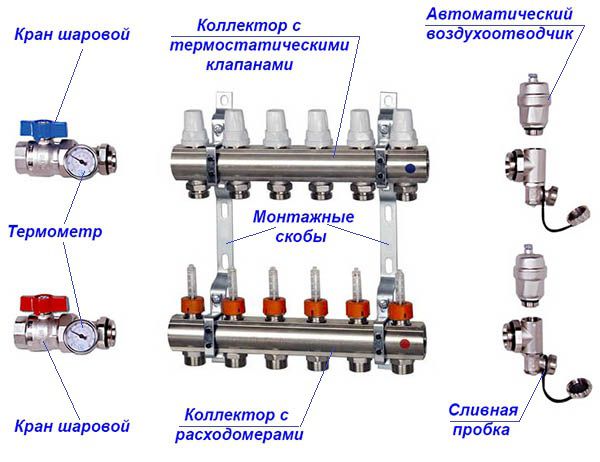 L'ensemble radiateur-distributeur se compose généralement de deux peignes de distribution reliés l'un à l'autre. Le premier dirige le liquide vers les radiateurs, le second retourne vers la chaudière. Ces collecteurs, en règle générale, ne fournissent pas d'équipements et d'appareils supplémentaires, afin d'économiser de l'argent.