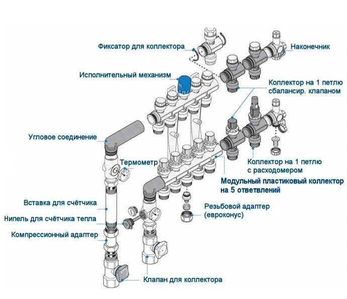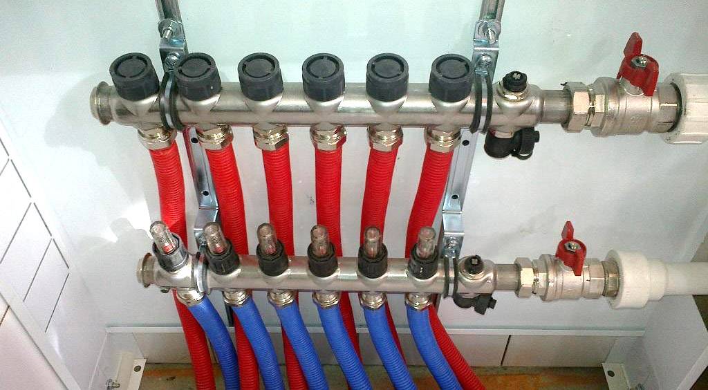 Le nombre de circuits peut varier de 2 à 10. Tout dépend des consommateurs. Les collecteurs intermédiaires peuvent être en laiton, en acier inoxydable, en polypropylène. Choisissez le plus souvent le polypropylène, car ce sont les moins chers.