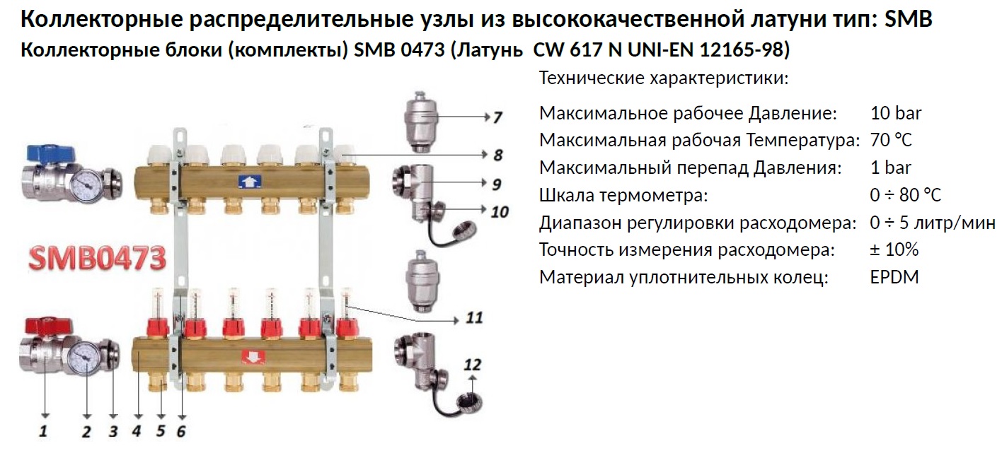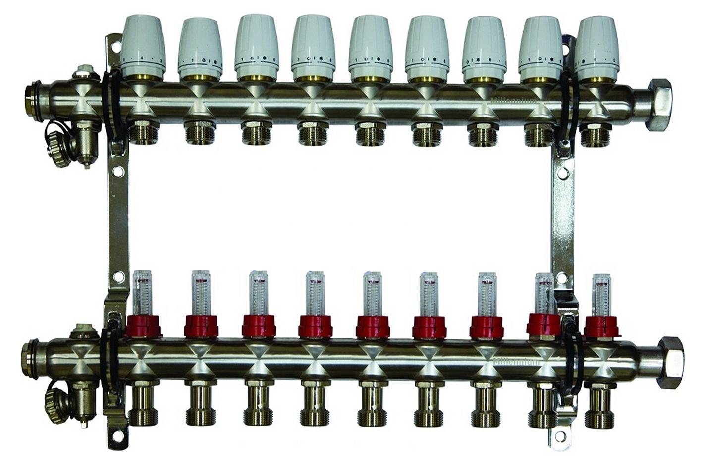 Pour contrôler les processus thermiques dans des pièces séparées, des vannes de sortie d'air et de vidange, des compteurs de chaleur et des débitmètres peuvent être montés sur le corps du peigne.