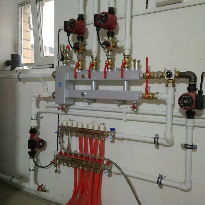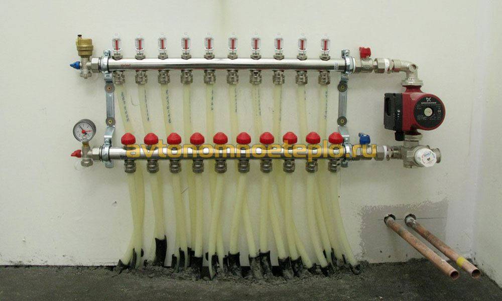 Idéalement, toutes les branches de connexion doivent avoir la même longueur. S'il est impossible de maintenir une seule longueur des circuits, une pompe individuelle peut être installée sur chacun d'eux, ce qui maintient la circulation du liquide de refroidissement. Selon ce schéma, les planchers d'eau chaude sont généralement équipés, dont chaque branche est équipée non seulement de sa propre pompe, mais également d'une automatisation.
