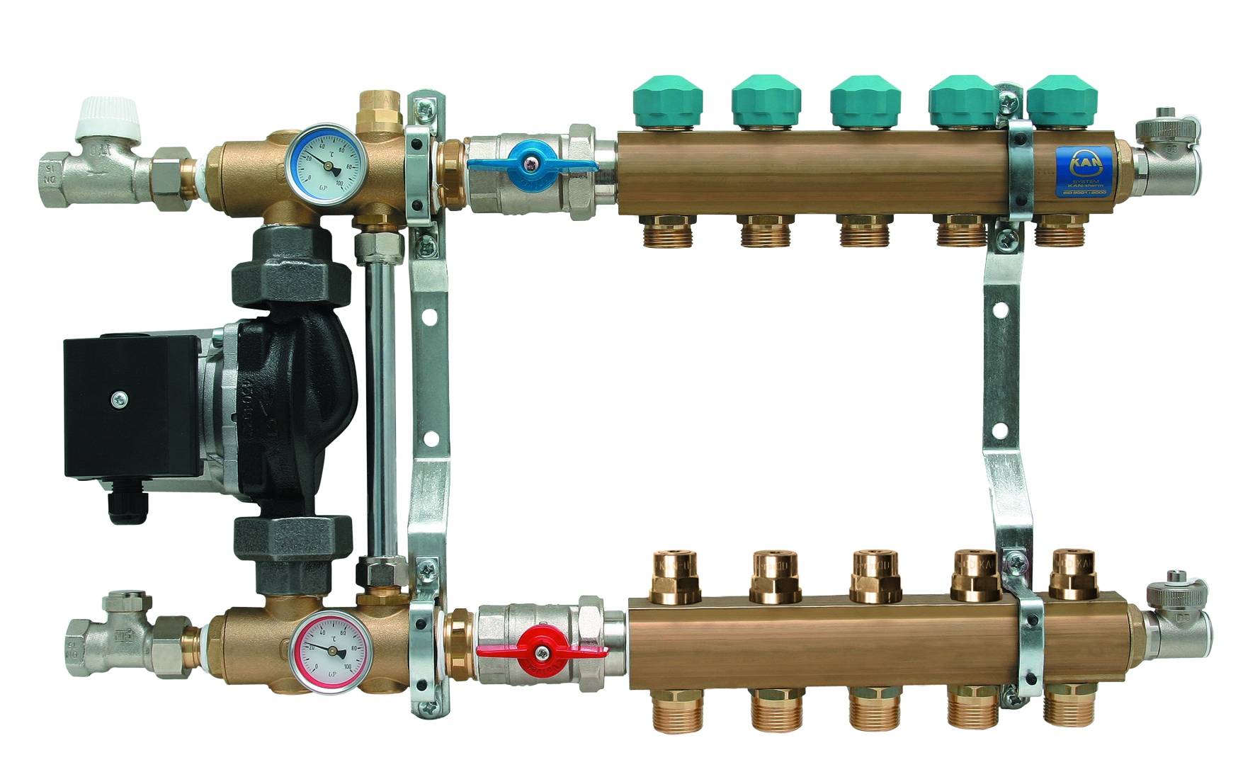 Complexe - contient de nombreux éléments supplémentaires utiles: raccords de canalisation; capteur de contrôle et de comptabilité ; automatisation. Des capteurs de température ou, comme on les appelle également, des capteurs thermiques sont installés dans des peignes avec un système électronique ou mécanique. Ils sont en contrôle total débit et approvisionnement en eau les tuyaux sont particulièrement pratiques lorsqu'un liquide de refroidissement est connecté.