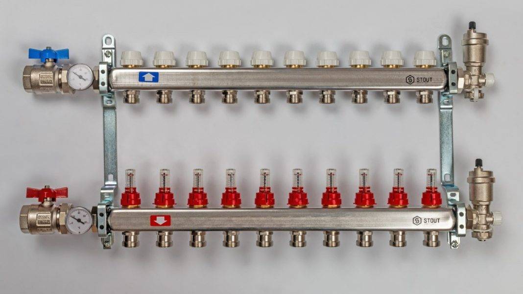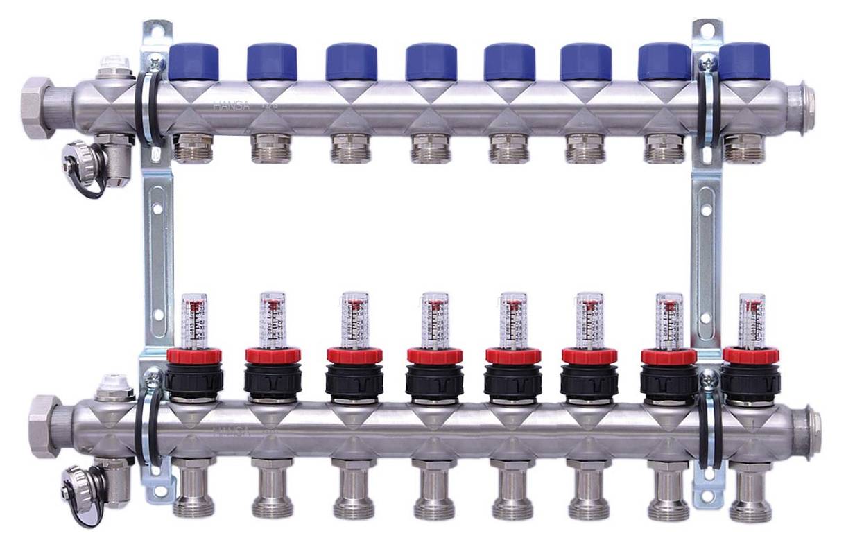 Tous les éléments, qu'il s'agisse d'une grille de chauffage au sol, d'un radiateur ou d'un convecteur à eau, reçoivent un liquide de refroidissement de température égale, ceci est réalisé en réglant des débitmètres spéciaux qui contrôlent la quantité de liquide de refroidissement fournie à chaque branche. Par exemple, pour obtenir la même température du sol chaud dans la pièce proche et éloignée, il est nécessaire de régler les débitmètres correspondants de sorte que le liquide de refroidissement se déplace plus lentement à travers les tuyaux dans la branche de la pièce proche, et plus rapidement dans la branche de la pièce du fond.