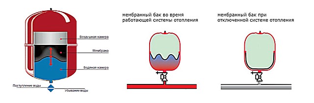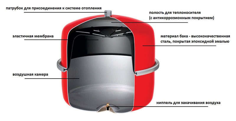Avec une diminution de la pression du liquide de refroidissement dans le système, des actions opposées se produisent. Le gaz (air) comprimé dans la chambre pneumatique se dilate et déplace le liquide de la chambre hydraulique dans le système jusqu'à ce que la différence de pression soit rétablie. La conception élimine la possibilité de contact entre le liquide de refroidissement et l'air, réduisant ainsi le risque de rouille non seulement dans le réservoir, mais également dans d'autres parties du système de chauffage - canalisations, chaudières. Les vases d'expansion étanches sont équipés de soupapes de sécurité pour limiter la pression maximale dans le système de chauffage à un niveau acceptable. Cela caractérise également le réservoir en tant que dispositif de protection du système de chauffage.
