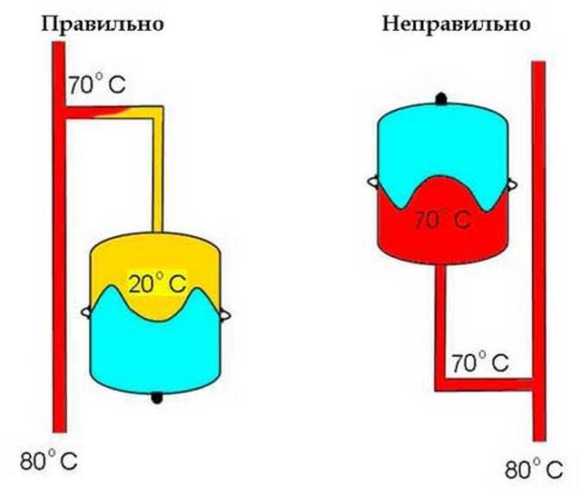 Un récipient de type fermé durera plus longtemps s'il est monté verticalement avec la chambre à air vers le haut. Tôt ou tard, la membrane épuisera ses ressources, des fissures apparaîtront. Avec un emplacement horizontal du réservoir, l'air de la chambre pénétrera rapidement dans le liquide de refroidissement, et celui-ci prendra sa place. Vous devrez installer d'urgence un nouveau vase d'expansion pour le chauffage. Si le conteneur est suspendu à l'envers sur le support, l'effet apparaîtra plus rapidement.