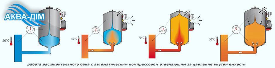 Lorsque la chaudière cesse de fonctionner, l'eau commence à refroidir, son volume diminue et la pression diminue également. Le gaz dans le réservoir repousse l'excès d'eau dans le système, comprimant le bulbe jusqu'à ce que la pression s'égalise à nouveau. Si la pression dans le système dépasse le maximum autorisé, une vanne d'urgence sur le réservoir s'ouvrira et libérera l'excès d'eau, à cause de quoi la pression diminuera.