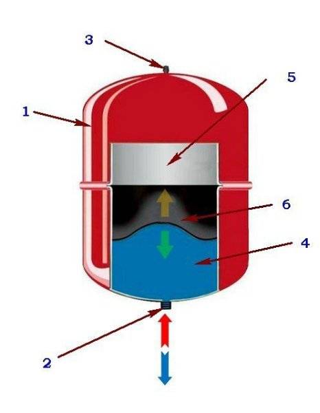 Le corps du réservoir à membrane est divisé en deux parties au moyen d'une membrane souple. Dans l'un d'eux, l'eau s'accumule et dans le second, l'air ou le gaz, qui est comprimé à une pression prédéterminée. Depuis les systèmes de chauffage, le liquide de refroidissement passe dans une partie et la seconde partie, qui est sous haute pression, est à ce moment remplie d'air supporté par le mamelon.