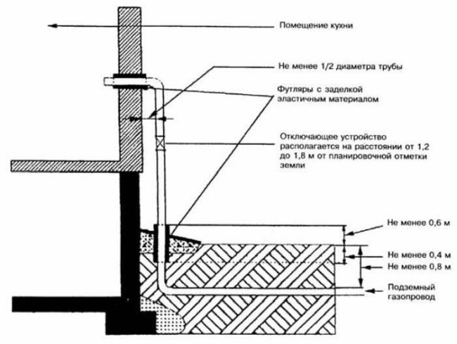 Si un gazoduc externe est situé sur le site, la distance entre celui-ci et la maison doit être d'au moins 2 m.La distance de sécurité pour les conduites souterraines est déterminée en fonction de la pression de l'alimentation en gaz. Dans les colonies, en règle générale, la pression dans le gazoduc ne dépasse pas 0,005 MPa. Dans ce cas, la fondation est posée à une distance d'au moins 2 m de la conduite de gaz.