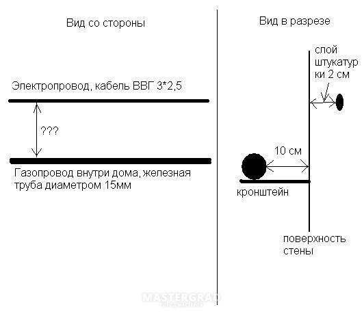 Les PES réglementent plus en détail les normes de distances de câblage ouvertes aux tuyaux à travers lesquels circulent des gaz explosifs. Comme l'exigent les documents réglementaires (PUE-6 clause 2.1.56), la distance autorisée dans la lumière entre les fils électriques sans protection ou sous isolation de protection et les canalisations contenant des substances neutres doit être d'au moins 50 mm. En cas de passage de gaz explosif dans la ligne, le jeu est supérieur à 100 mm .