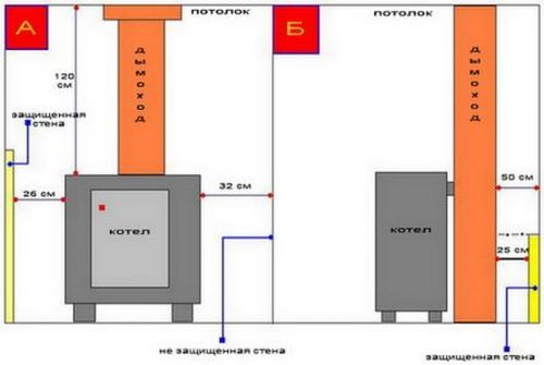 Des cheminées ordinaires sont élevées à 0,5 m au-dessus du faîte de la maison. Ils sont disposés à la fois à l'intérieur du mur de la maison, et à l'intérieur de la maison ou derrière son mur. Pas plus de 3 coudes sont autorisés sur le tuyau. La première section du tuyau qui relie la chaudière à la cheminée principale ne doit pas dépasser 25 cm et le tuyau doit avoir une ouverture pouvant être fermée pour le nettoyage. Pour les chaudières avec des cheminées ordinaires et une chambre de combustion ouverte, une grande alimentation en air est nécessaire. Il peut être équipé d'une fenêtre ouverte ou d'un tuyau d'alimentation séparé.