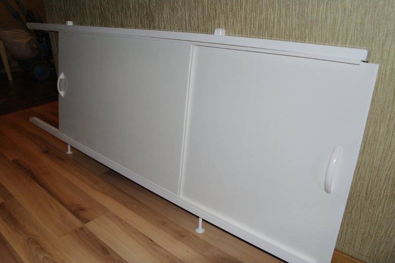 L'une des options d'écran les plus courantes est considérée comme un modèle à portes coulissantes. Cette conception se compose de pieds (ce sont aussi des raidisseurs et des traverses transversales), de patins (ce sont aussi un cadre) et d'une partie couvrante. La commodité est que l'espace derrière l'écran peut être utilisé tout au long de la baignoire