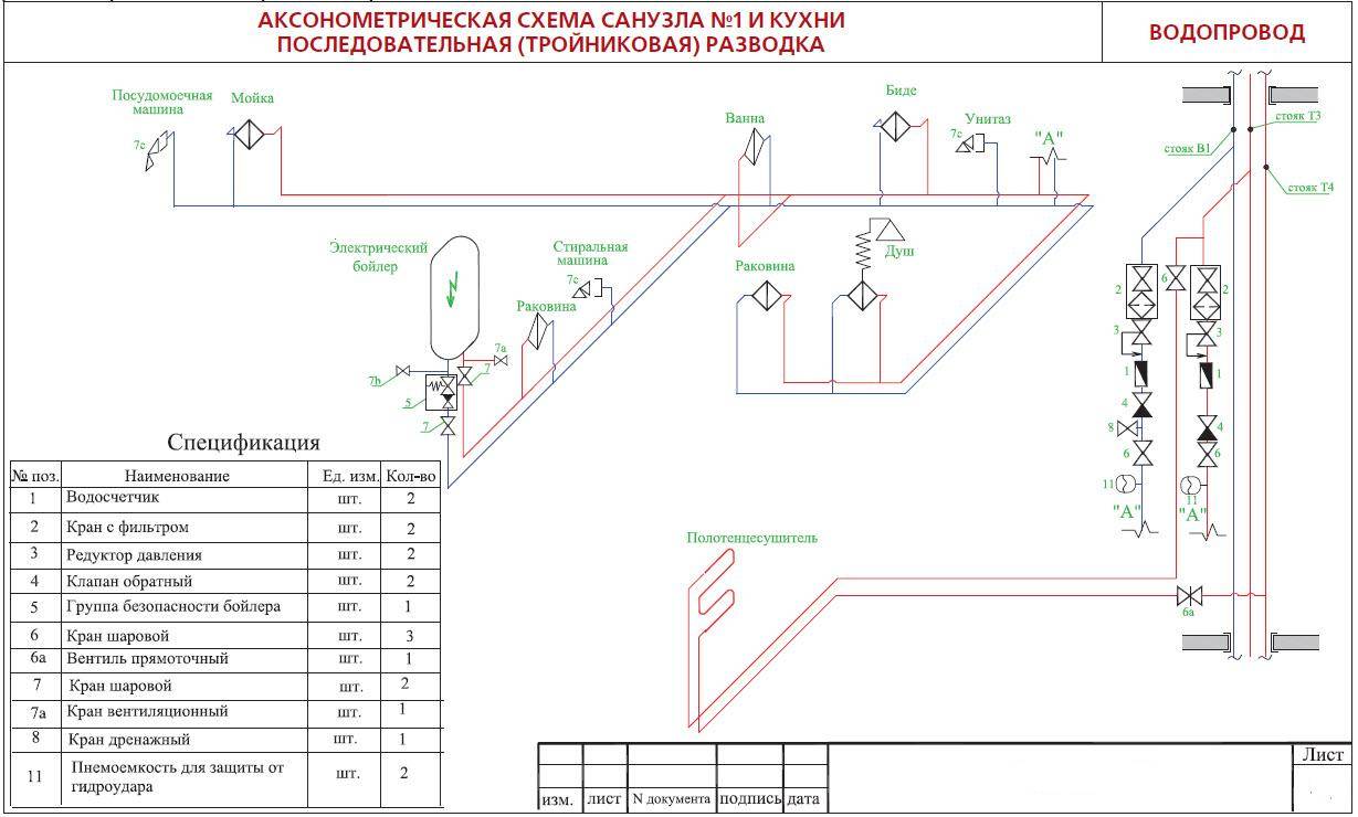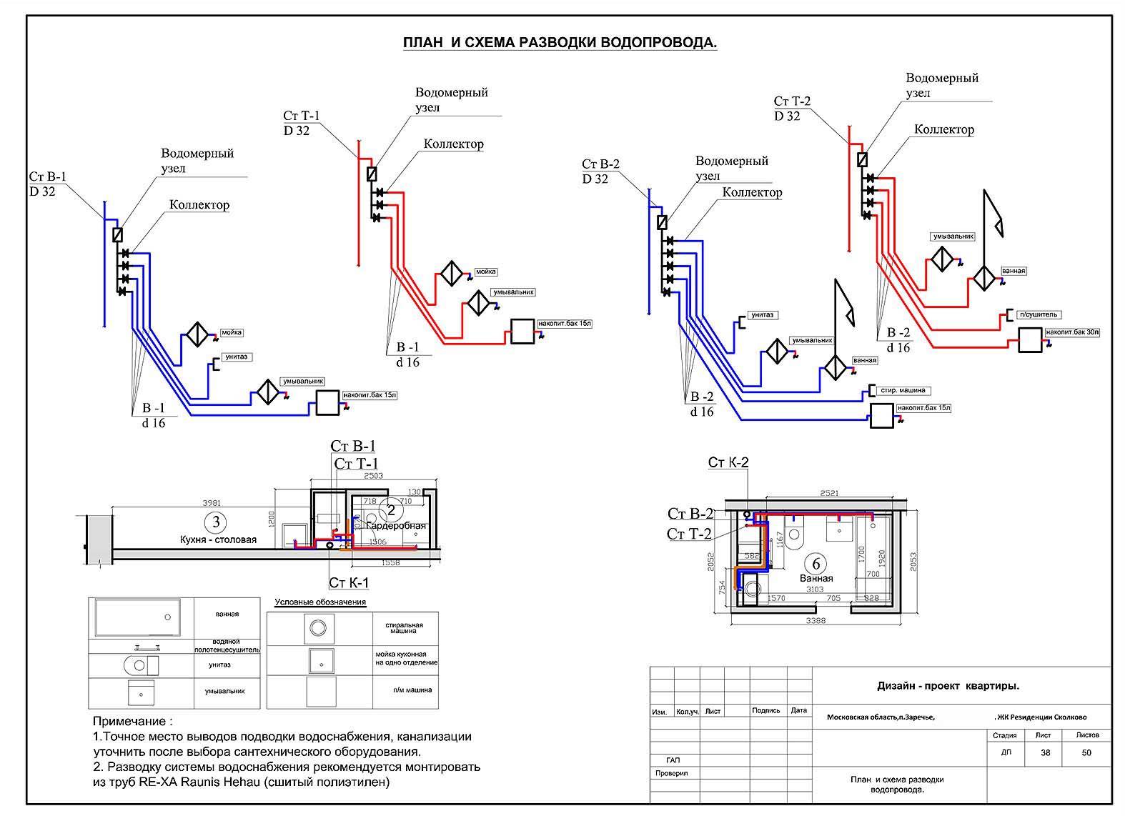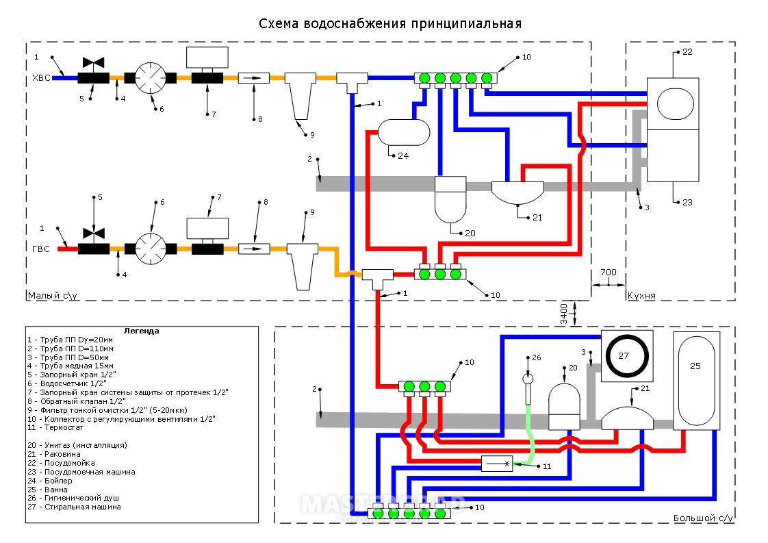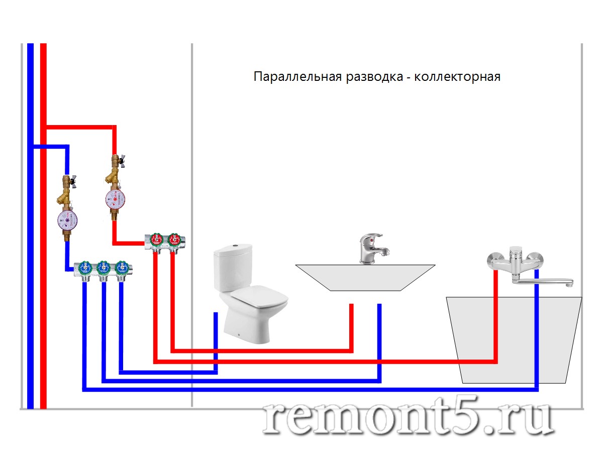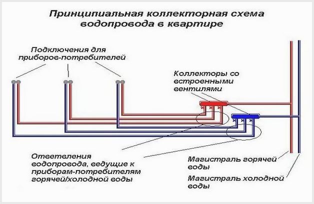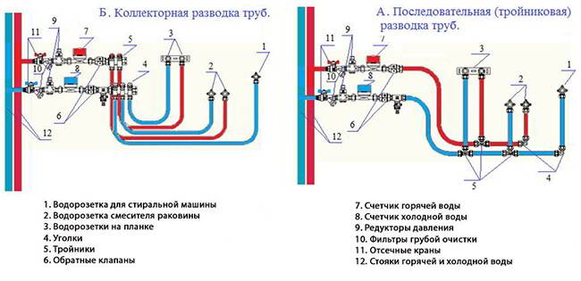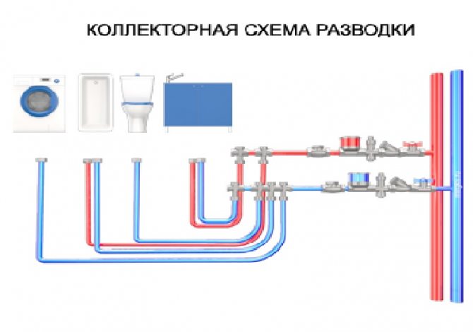 Actuellement, des prises d'eau sont utilisées, c'est-à-dire des conduites d'eau froide / eau chaude posées en stroboscopes. Avec les égouts, tout est beaucoup plus compliqué en raison du trop grand diamètre des communications. Par conséquent, une méthode combinée est utilisée ici :