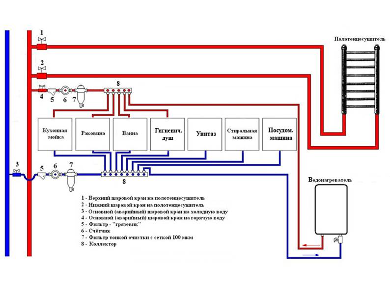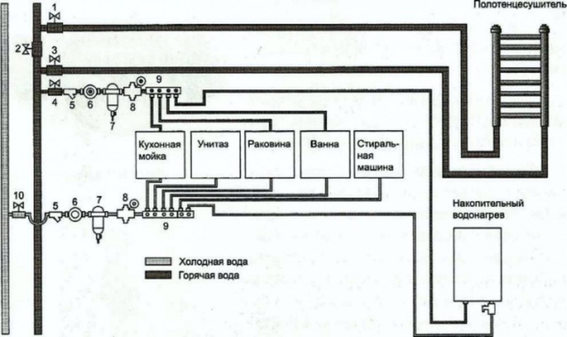 Cette procédure est répétée deux fois - pour un tuyau d'eau froide et un tuyau d'eau chaude. S'il n'y a qu'un seul tuyau central - uniquement froid, l'entrée du chauffe-eau est connectée au premier collecteur. À son tour, la sortie du chauffe-eau est introduite dans un collecteur séparé, qui distribuera de l'eau chaude.