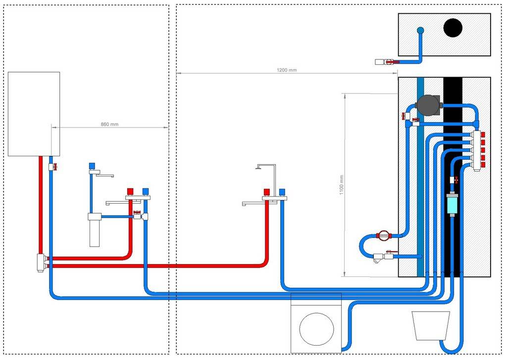 Par exemple, dans un appartement standard, il est préférable d'installer le collecteur dans les toilettes, derrière le réservoir de vidange. Dans ce cas, la distance au premier consommateur (réservoir de vidange) et au deuxième consommateur (salle de bain) sera minimale.