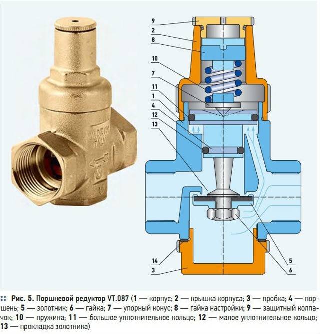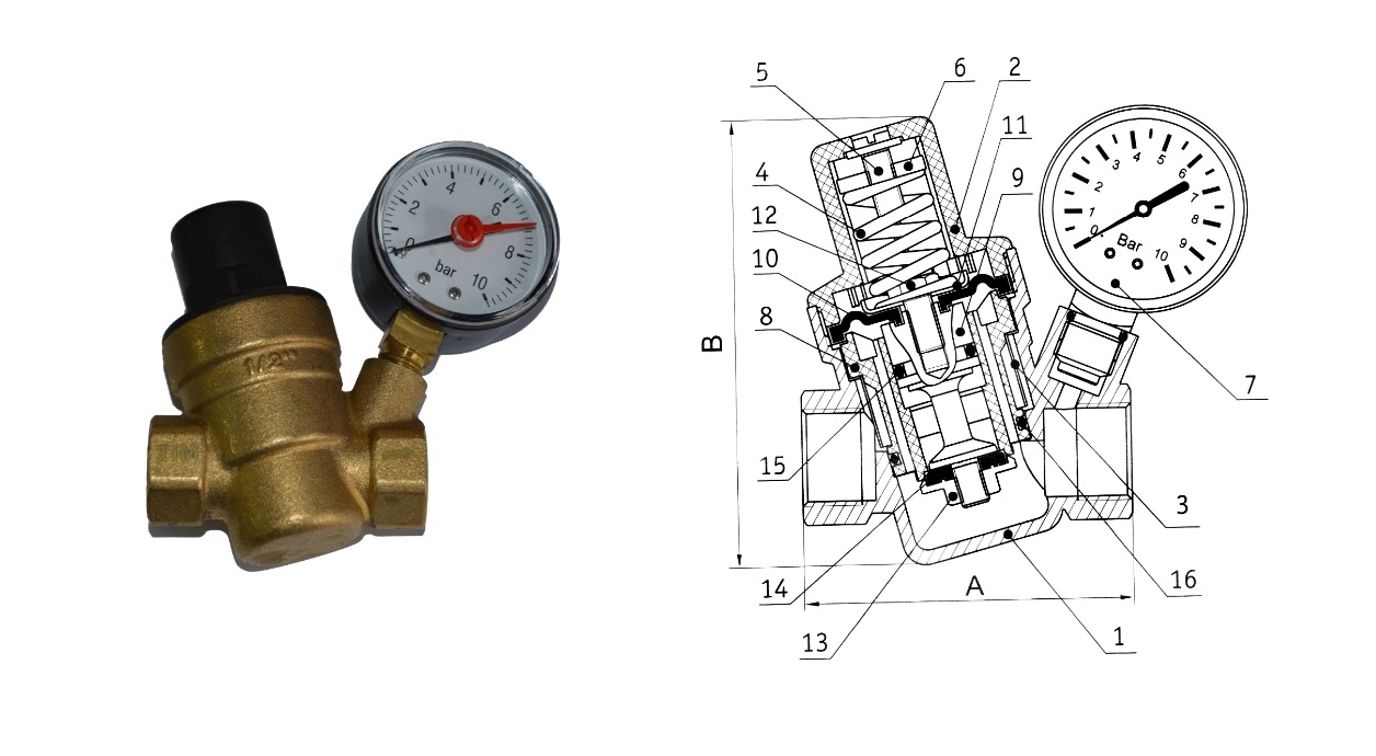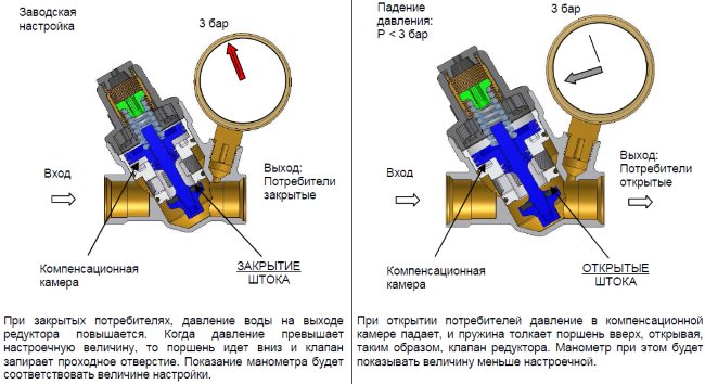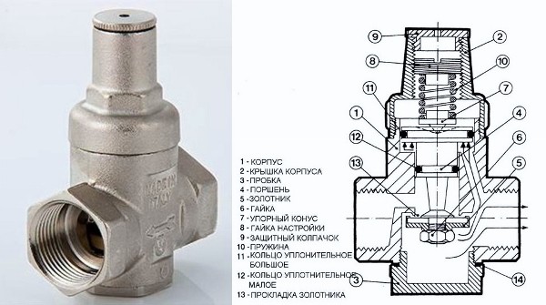 Un réducteur de pression d'eau est un dispositif qui stabilise et réduit la pression dans le réseau d'alimentation en eau, protégeant ainsi à la fois la canalisation elle-même et l'équipement ménager qui y est connecté contre la haute pression et les coups de bélier. Le détendeur est un appareil compact dans un boîtier métallique étanche avec deux trous filetés à l'entrée et à la sortie. Parfois, pour plus de commodité, un manomètre et une vis pour régler la pression sont connectés.