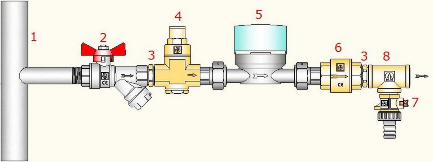 Schéma de raccordement des réducteurs de pression au système d'alimentation en eau de l'appartement : 1- filtre grossier mécanique ; 2 - clapet anti-retour ; 3 - Compteurs ECS et eau froide ; 4 - filtre de lavage ; 5 - réducteur de pression