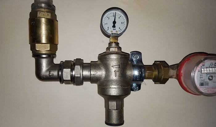 Installation régulateur de pression d'eau dans l'appartement évite rupture des vannes d'arrêt, ainsi que des équipements spéciaux, en fonctionnement normal du réseau d'alimentation en eau sous pression nominale: lave-vaisselle et lave-linge, douches et autres équipements.