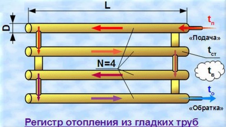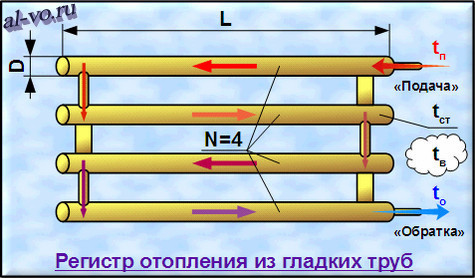 Registres de chauffage à serpentin: L - longueur de l'appareil de chauffage, D - diamètre des tuyaux, h - distance entre les tuyaux (plus que le diamètre de 50 mm)