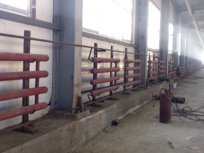 Utilisation de registres de chauffage horizontaux en tubes lisses avec câblage inférieur pipeline. Dans ce cas, les produits sont soigneusement placés autour du périmètre de la pièce plus près de la surface du sol. Dans un immeuble résidentiel, des tuyaux passent sous les fenêtres. Dans les locaux industriels, l'emplacement des appareils de chauffage dépend de la hauteur des plafonds, des caractéristiques de l'aménagement de l'installation et de l'emplacement des équipements industriels.