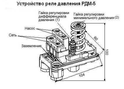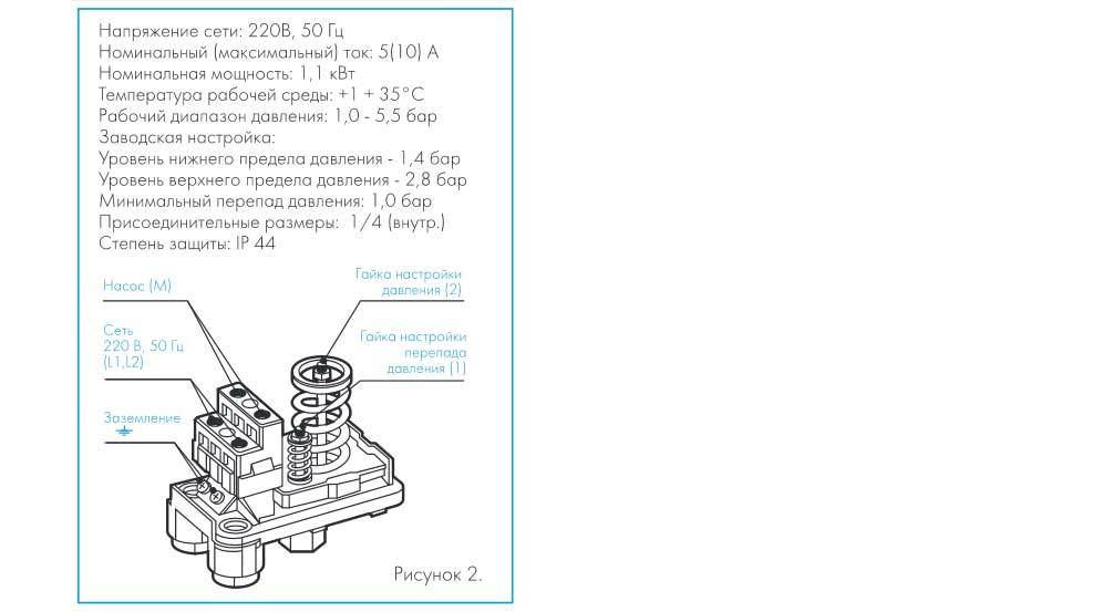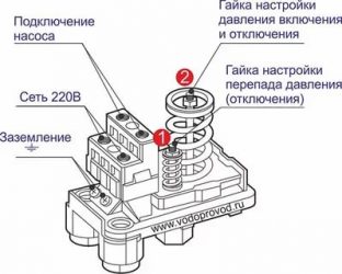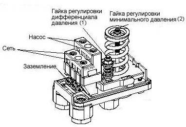 Cet appareil se compose de deux parties - électrique et hydraulique. La partie électrique est un groupe de contacts qui se ferme et s'ouvre sur / hors de la pompe. La partie hydraulique est une membrane qui exerce une pression sur la base métallique et des ressorts (grands et petits) avec lesquels la pression marche/arrêt de la pompe peut être modifiée.