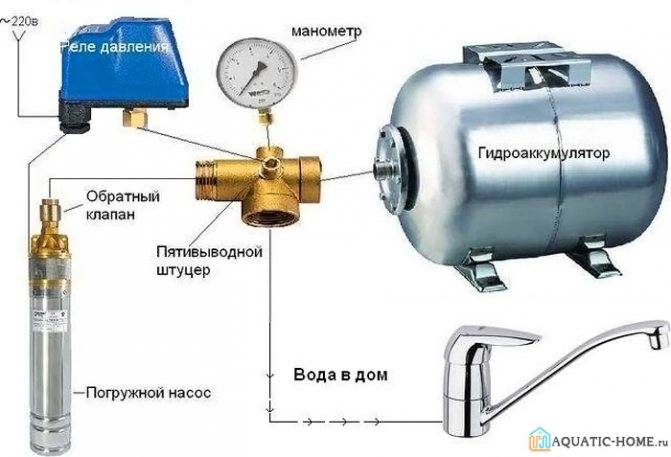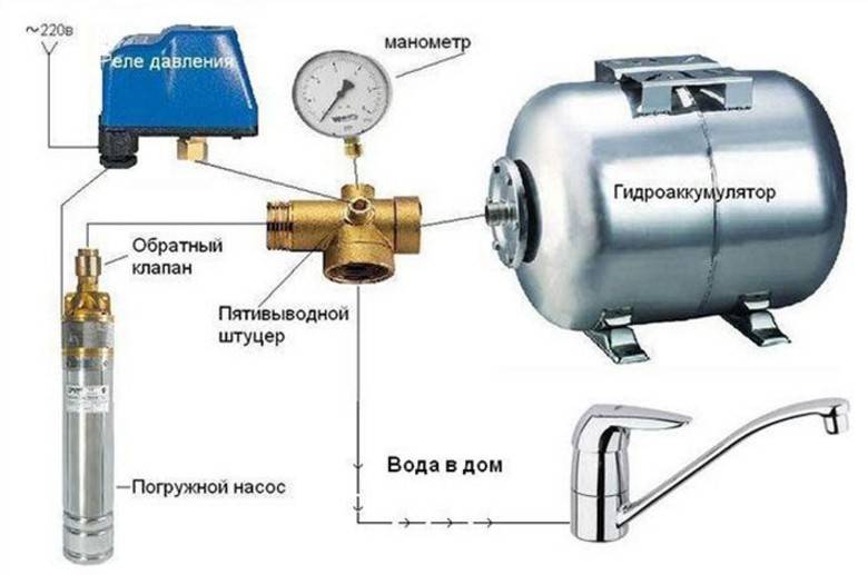 Le relais est connecté entre la sortie du réservoir et le clapet anti-retour sur la canalisation. Afin d'économiser de l'argent, tous les séparateurs sont généralement assemblés à partir de composants séparés, mais en fait, il est plus facile d'acheter un raccord à cinq voies, où des filetages sont fournis pour toutes les pièces, y compris un manomètre