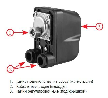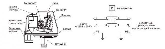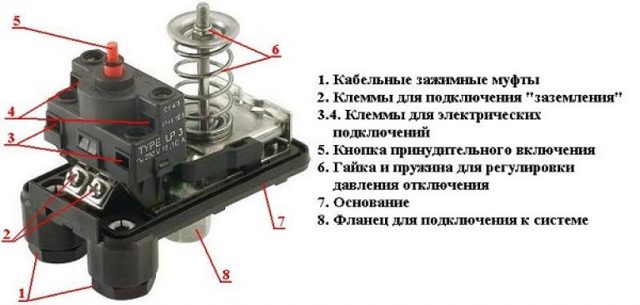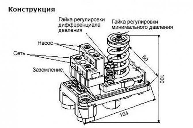 Le relais est un petit bloc avec des ressorts de pression maximum et minimum.Son réglage est effectué au moyen des mêmes ressorts qui réagissent aux variations de la force de pression. Ayant atteint les valeurs minimales, le ressort s'affaiblit, et au maximum, il se comprime encore plus. Ainsi, il provoque l'ouverture des contacts du relais, et en conséquence allume et éteint la station de pompage.