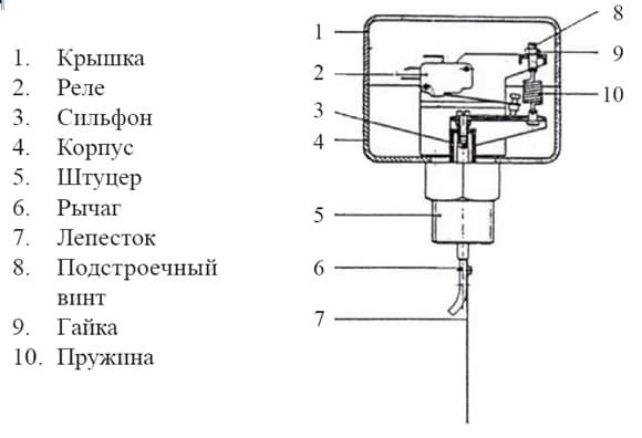 Les appareils mécaniques sont principalement utilisés, ils sont plus fiables, ils sont moins chers. Mécanique - situé dans un boîtier durable, où se trouvent les pièces suivantes : un piston, une cloison élastique, une plate-forme métallique, un ensemble de contact.