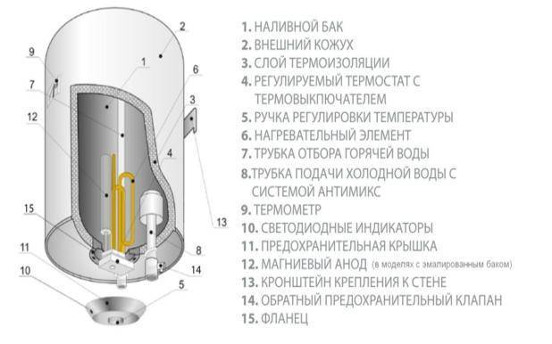 Avant de procéder à l'auto-réparation du chauffe-eau Termex à la maison, vous devez comprendre sa conception. Lors de son étude, il s'avère que son dispositif n'est pas trop compliqué, puisqu'il est constitué d'un petit nombre de composants, présentés ci-dessous :