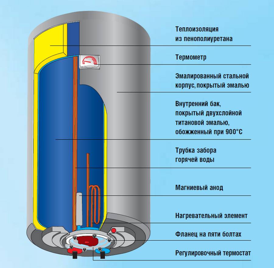 L'apport d'eau chaude s'effectue par un tube situé en haut de l'appareil. L'arrivée de fluide froid est située en bas de l'appareil. Le réservoir métallique est protégé de la corrosion par une anode spéciale en magnésium, qui possède une certaine ressource de travail. L'élément doit être remplacé une ou deux fois par an, selon la dureté de l'eau.