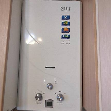 Le geyser Oasis, que de nombreux acheteurs considèrent comme des produits russes ou allemands, est un équipement de chauffage de l'eau d'un fabricant chinois. Il est conçu pour le chauffage individuel de l'eau pour les besoins domestiques. Ils sont fabriqués en deux types - automatique avec une chambre de combustion fermée et ouverte. Les premiers fonctionnent avec le mouvement forcé du mélange gaz-air à l'aide d'une cheminée coaxiale et avec une prise d'air de la rue, tandis que les seconds le reçoivent directement des locaux.