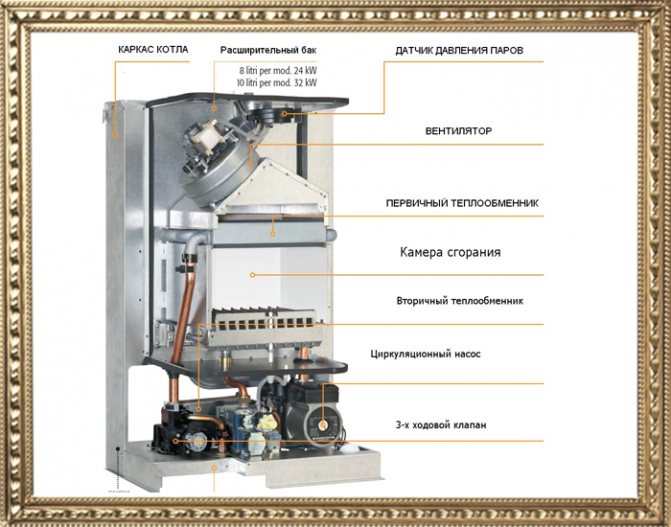 4. Brûleur à gaz - le dispositif principal de la chaudière, qui brûle du combustible pour produire de l'énergie thermique. La réparation de cet appareil consiste à nettoyer les buses.