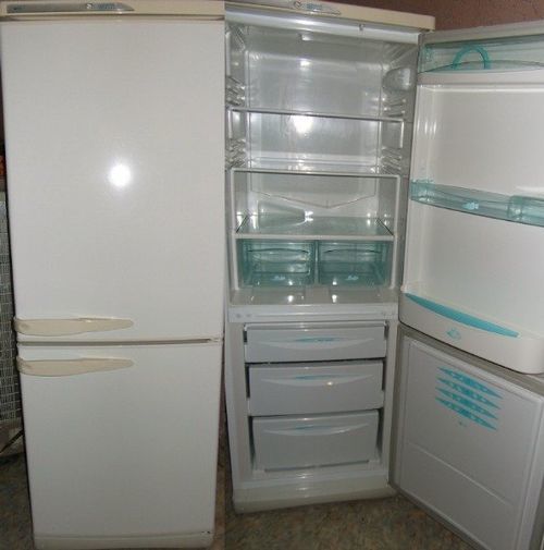 - Stinol 103. Il s'agit d'un réfrigérateur d'un volume total de 340 litres. Le congélateur est situé dans la partie inférieure du corps, le dégivrage est manuel (système de dégivrage goutte à goutte). La partie intérieure de la porte comporte 3 étagères, tandis que la partie principale comprend 4 étagères et 2 conteneurs en plastique transparent.