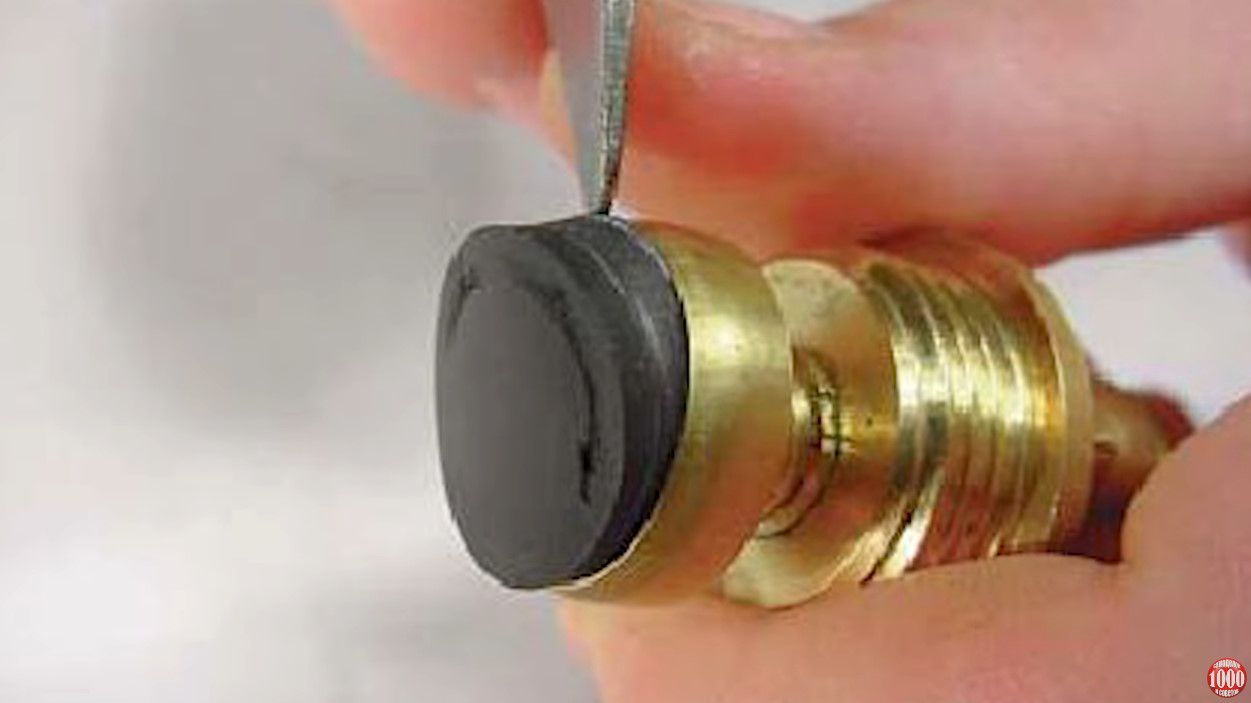 - Afin d'éliminer la fuite, nous devons augmenter l'épaisseur de l'anneau aplati, mais comme cela n'est pas possible, nous allons simplement augmenter la longueur du coffret intérieur. Pour ce faire, regardez la photo ci-dessus - vous pouvez y voir où coller deux ou trois couches de ruban électrique pour augmenter l'épaisseur de la plaque supérieure en céramique. De plus, une rondelle faite maison en fil de cuivre peut être remplacée sous la bague d'étanchéité en caoutchouc, comme si elle augmentait l'épaisseur du joint. (Voir aussi l'article Comment choisir un évier : caractéristiques.)