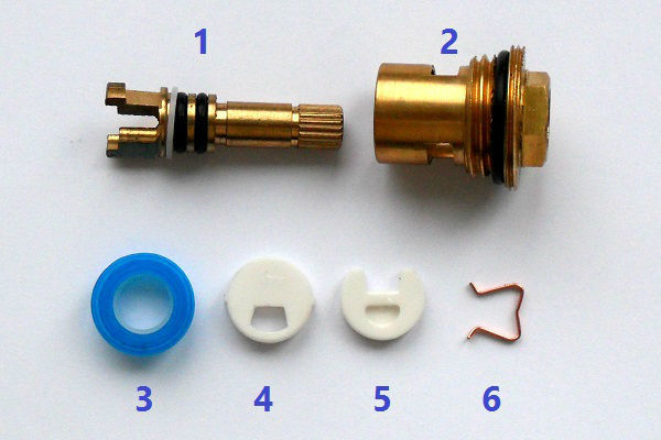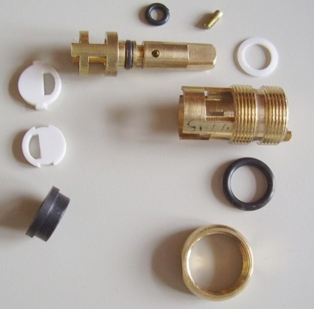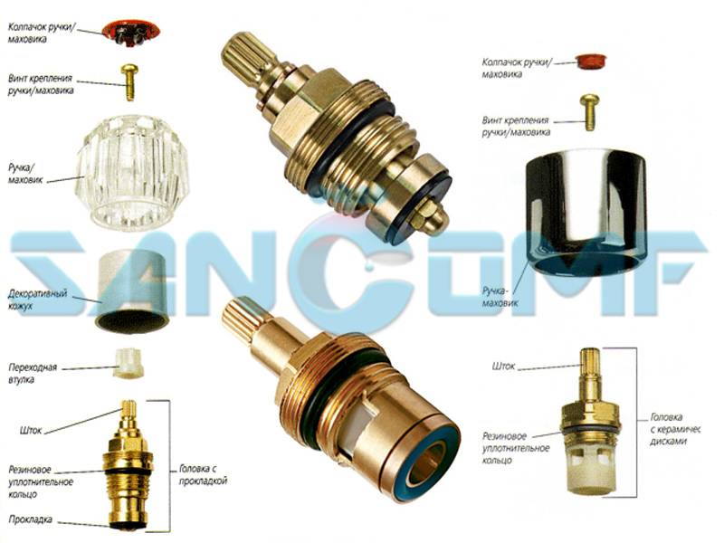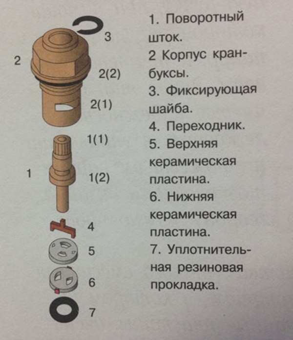 L'ensemble du kit de réparation est divisé en parties mobiles et fixes, la première comprenant une bague ou un support de retenue, une tige avec une fourche, un silencieux et une plaque supérieure en céramique avec un trou. Les parties fixes comprennent le boîtier lui-même, la plaque inférieure en céramique avec un trou et la bague en caoutchouc pour l'étanchéité. (Voir aussi l'article Flexible raccord de robinet: particularités.)